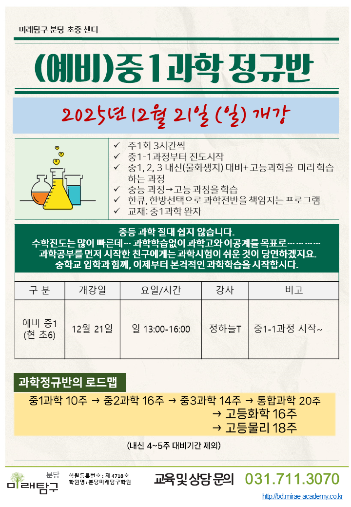 <예비중1과학반(중등물화생지)>12월21일 개강